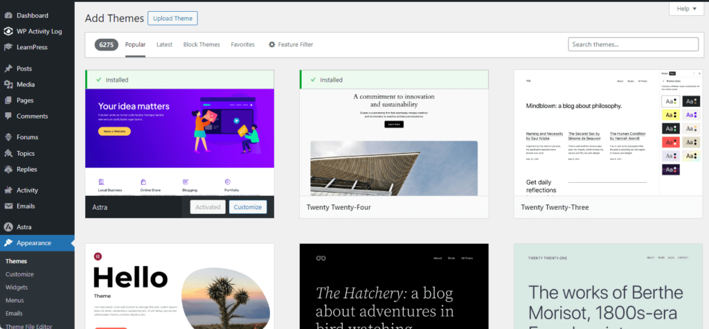 To install the Astra theme, go to Appearance > Themes > Add New Themes, and you should see Astra near the top or you can search for it on the righthand side.