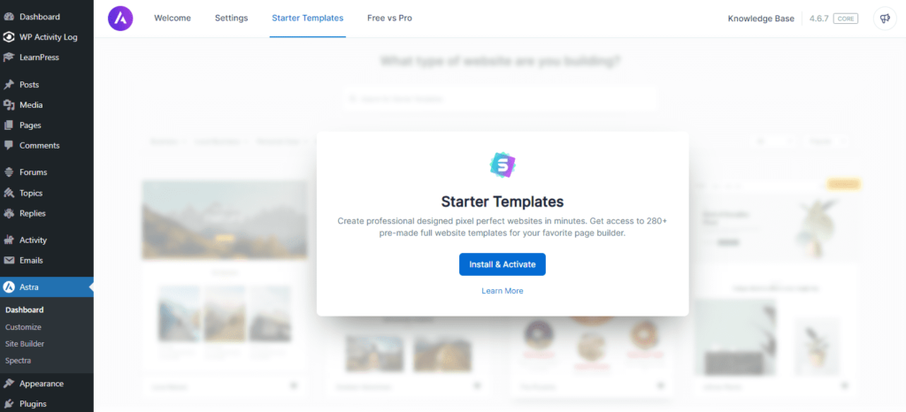 Go to Astra > Dashboard > Starter Templates > Install in the top tabs or on the righthand side. You can also go to Plugins > Add New and search for Starter Templates.