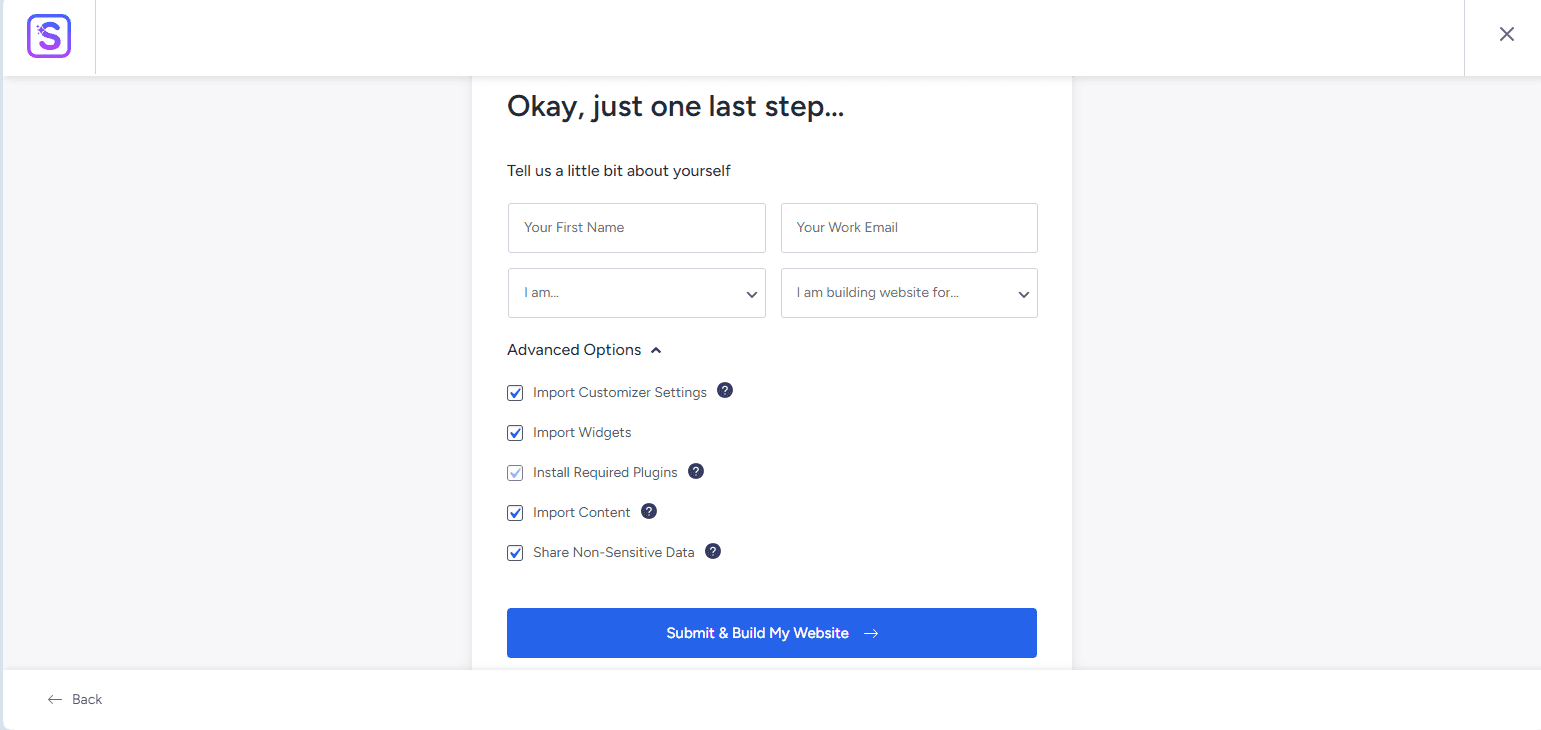 You don’t need to fill in your personal information. You can just click “Submit & Build My Website.” Don’t change any of the advanced options.