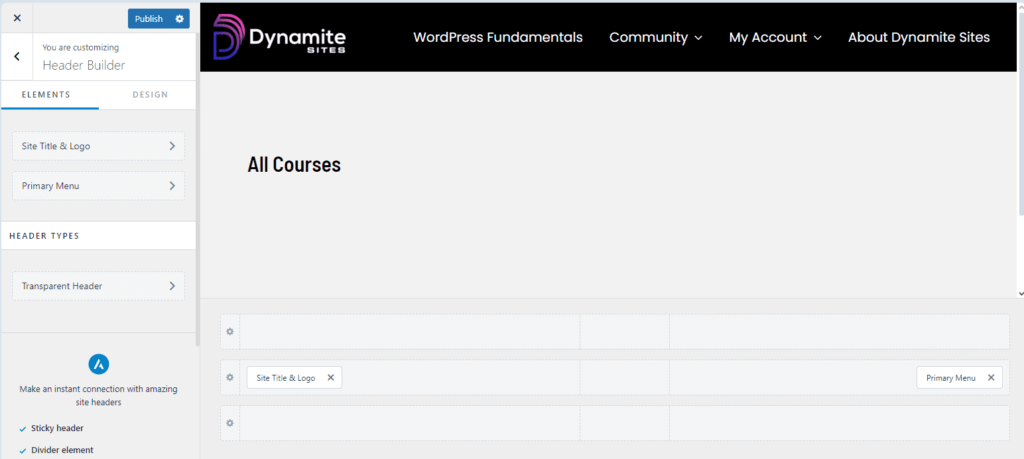 Go to Header Builder, and you’ll see Site Title & Logo, where you can change the name of your website and add a logo for branding. You don’t need to go to Primary Menu because we already configured that.