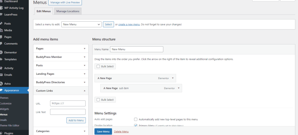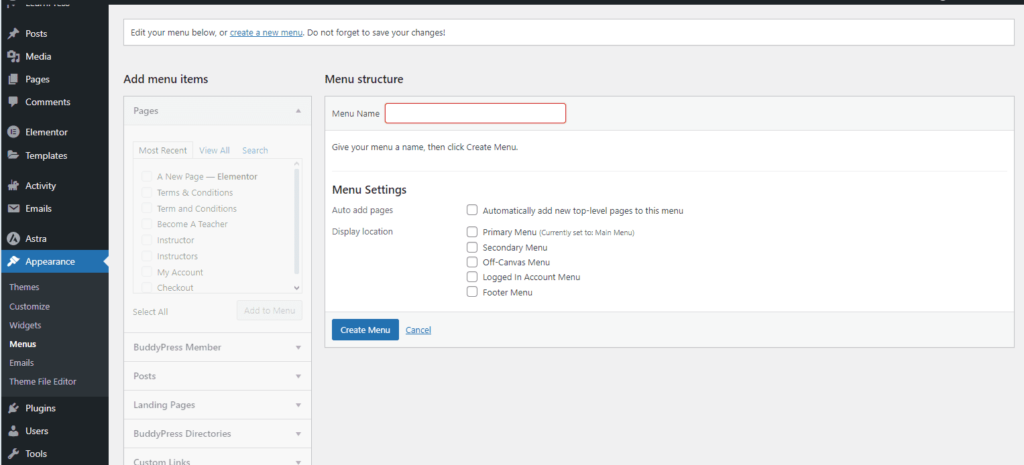 Click on “Create a New Menu” near the top and give your menu a name. Choose a location as well, most likely the primary menu, which will show at the top of the website.