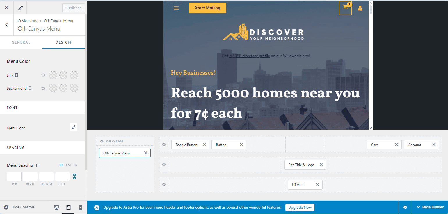 Then click on Off-Canvas Menu in the primary header under the preview of the website.
