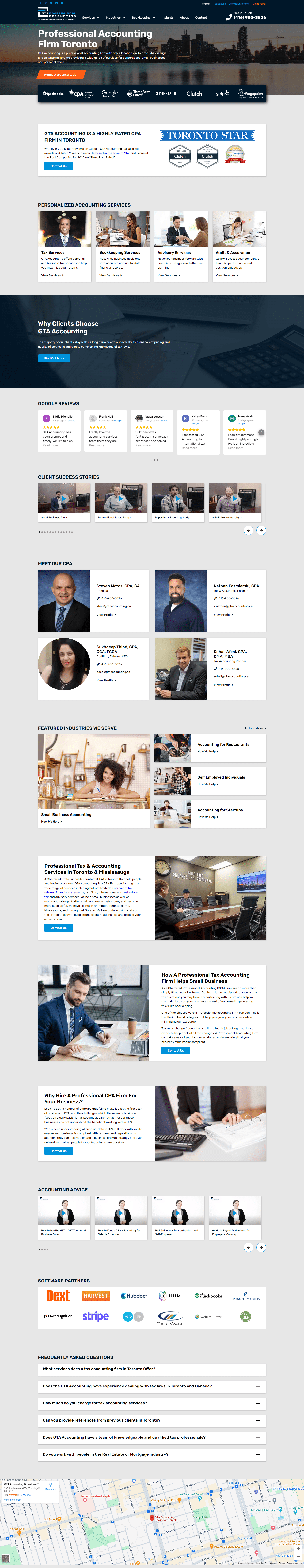 Like the background picture of Toronto, the map makes it very clear to the web visitor searching in Toronto that GTA Professional Accounting is a local firm and makes it easy for the user to determine how quickly he or she can reach the office.