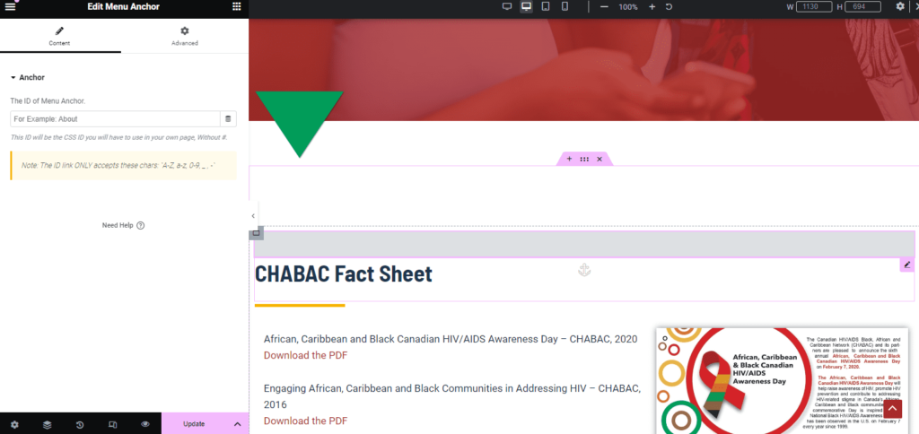 Find the widget called Menu Anchor by scrolling or typing it in the Elementor panel. Drag and drop the widget where you want to the user to go, and then give the anchor a name, like “testimonials” if it’s above the testimonials.