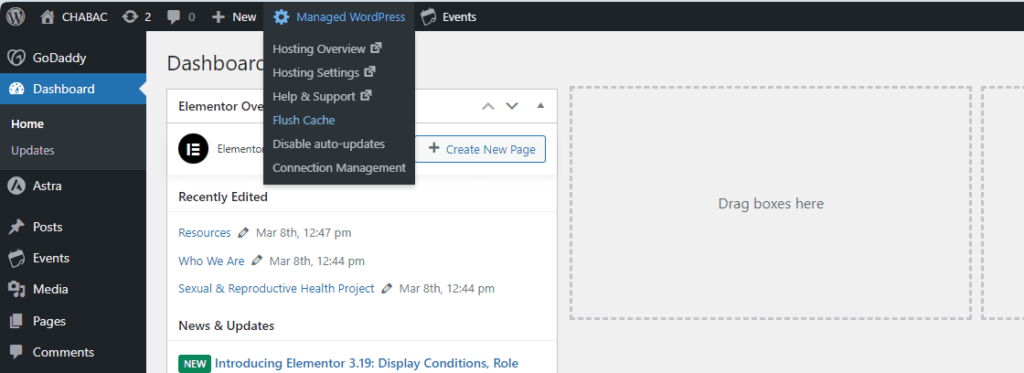 So, go to your Dashboard > Managed WordPress in the admin toolbar above, and you’ll see a menu with some settings from your hosting account.