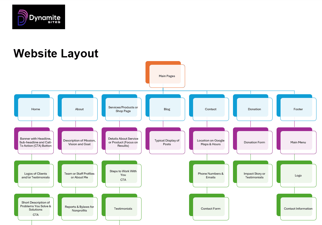 Download this website layout template, featured below, to organize the pages and sections you want on your website, and what order, inspired by the previous lesson on high-converting pages.