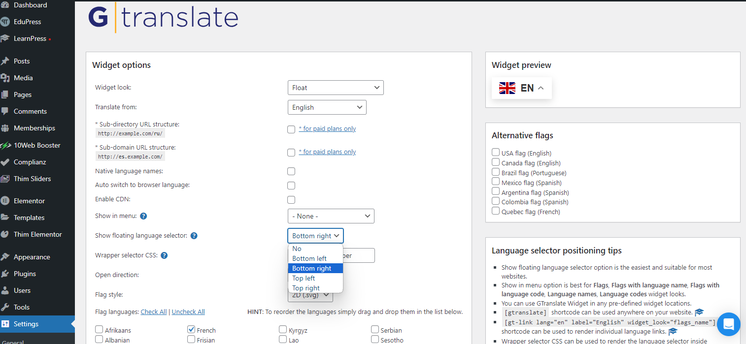 Under Widget options > Widget look, you can change the appearance of the language selector to one that floats on top of the screen, to a dropdown menu, to a series of flags and more. Just click on the different options to see what they look like in the “Widget preview” box on the righthand side.