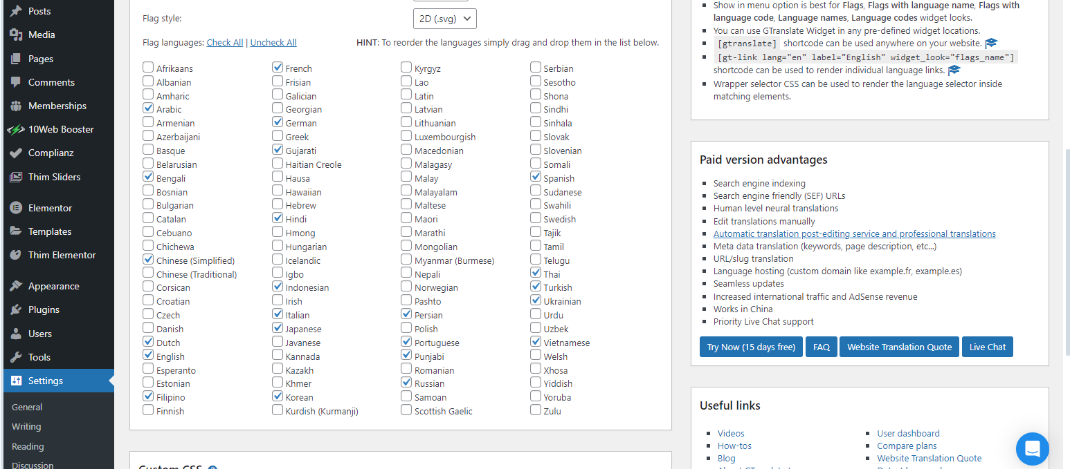After it’s activated, go to Settings > GTranslate, and you see the dashboard where you can change all the settings. But there are only a few settings that you need to change.